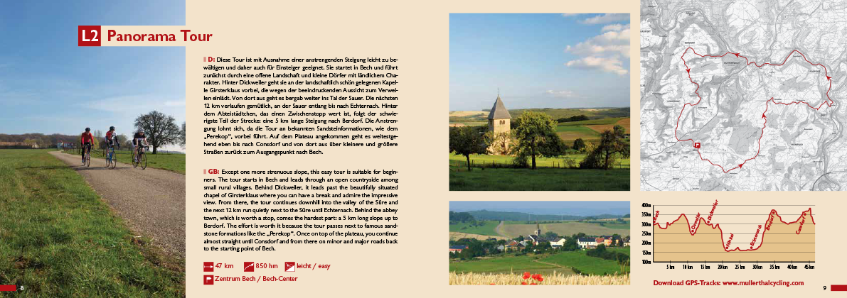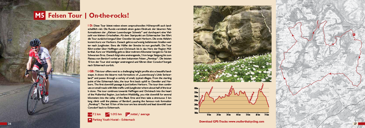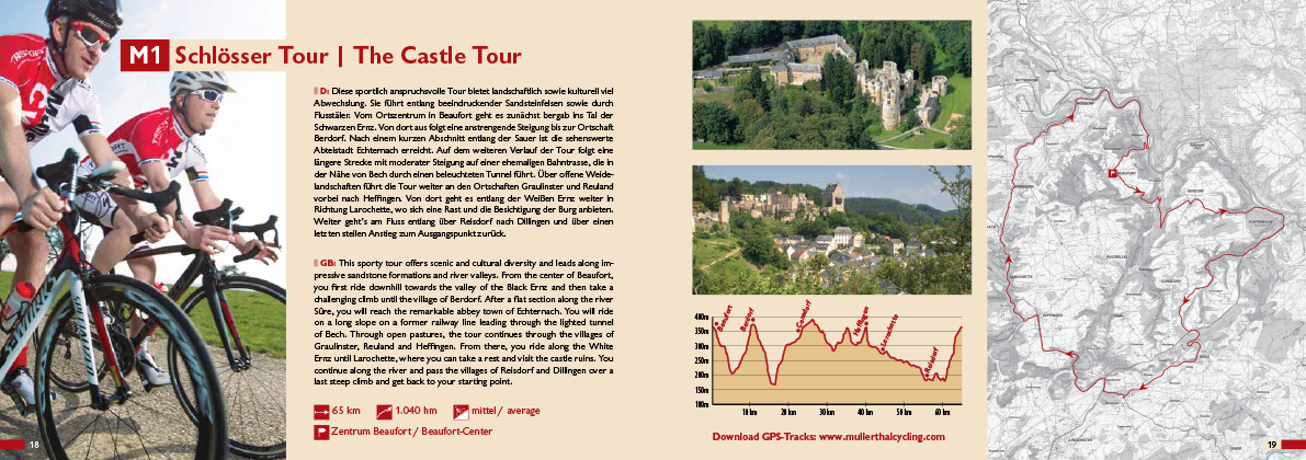 Sie fahren vorbei an beeindruckenden Felsformationen, ruhigen Bachtälern und erfreuen sich während der Fahrt an kulturellen Perlen wie beispielsweise Echternach, die älteste Stadt Luxemburgs, und den Burgruinen von Beaufort und Larochette.